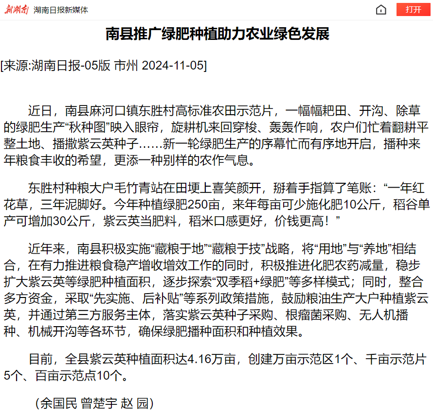 近年來,南縣積極實施“藏糧于地”“藏糧于技”戰略,將“用地”與“養地”相結合,在有力推進糧食穩產增收增效工作的同時,積極推進化肥農藥減量,穩步擴大紫云英等綠肥種植面積,逐步探索“雙季稻+綠肥”等多樣模式;同時,整合多方資金,采取“先實施、后補貼”等系列政策措施,鼓勵糧油生產大戶種植紫云英,并通過第三方服務主體,落實紫云英種子采購、根瘤菌采購、無人機播種、機械開溝等各環節,確保綠肥播種面積和種植效果。
